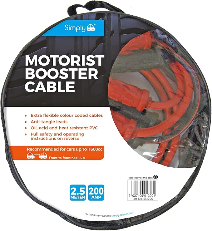 Simply SM200 Zip-bag Motorist Jump Leads Booster Cable 200AMP 2.5M Long Anti-tangle leads Oil acid and heat resistant PVC Fully Insulated Metal Clips and Operating Instructions